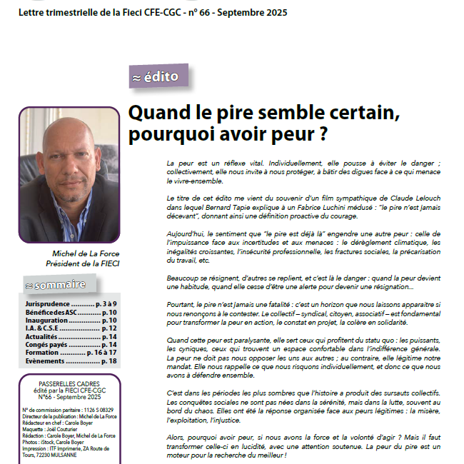 Jurisprudence p. 3 à 9 Bénéfice des ASC p. 10 Inauguration p. 10 I.A. & C.S.E p. 12 Actualités p. 14 Congés payés p. 14 Formation p. 16 à 17 Evènements p. 18 N’attendez pas d’être en difficulté pour nous rejoindre en adhérant à la FIECI CFE-CGC. En plus de nous soutenir par votre adhésion,…